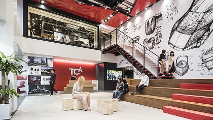 On the 2nd floor, there is a gallery space lined with student works and a presentation room with authentic facilities.